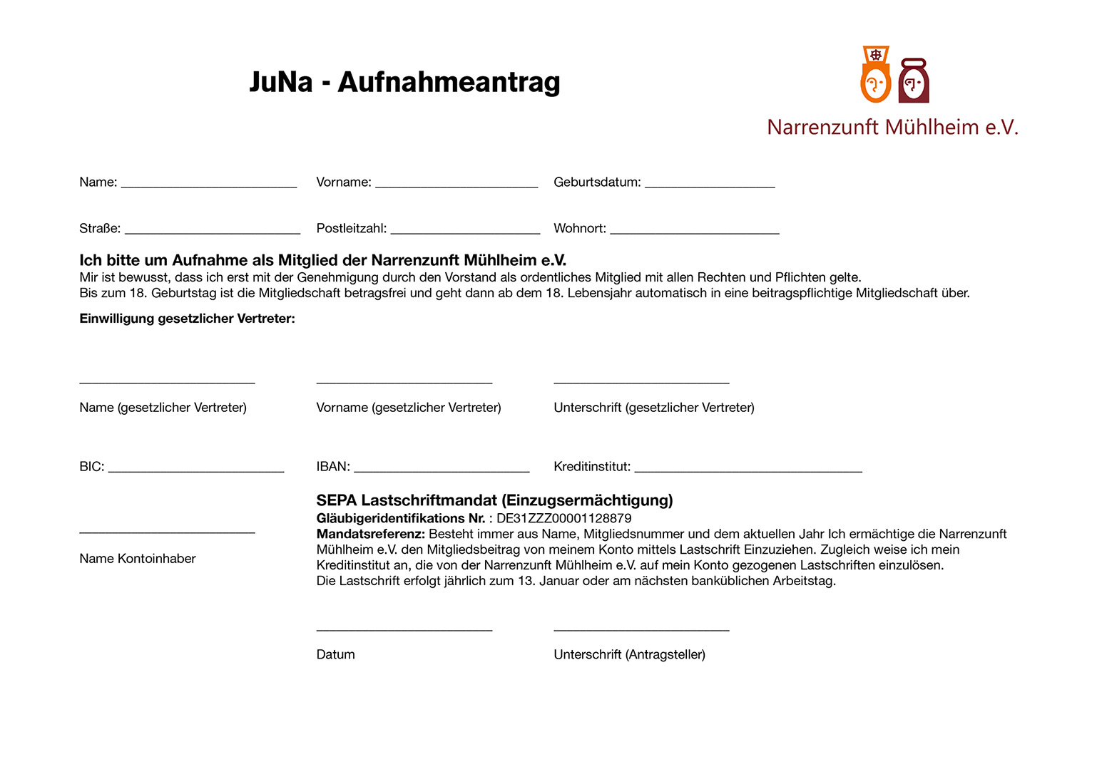 Um als Jungnarr Mitglied der Narrenzunft Mühlheim e.V. zu werden, fülle bitte folgenden Aufnahmeantrag aus und schicken ihn an die Adresse oben.